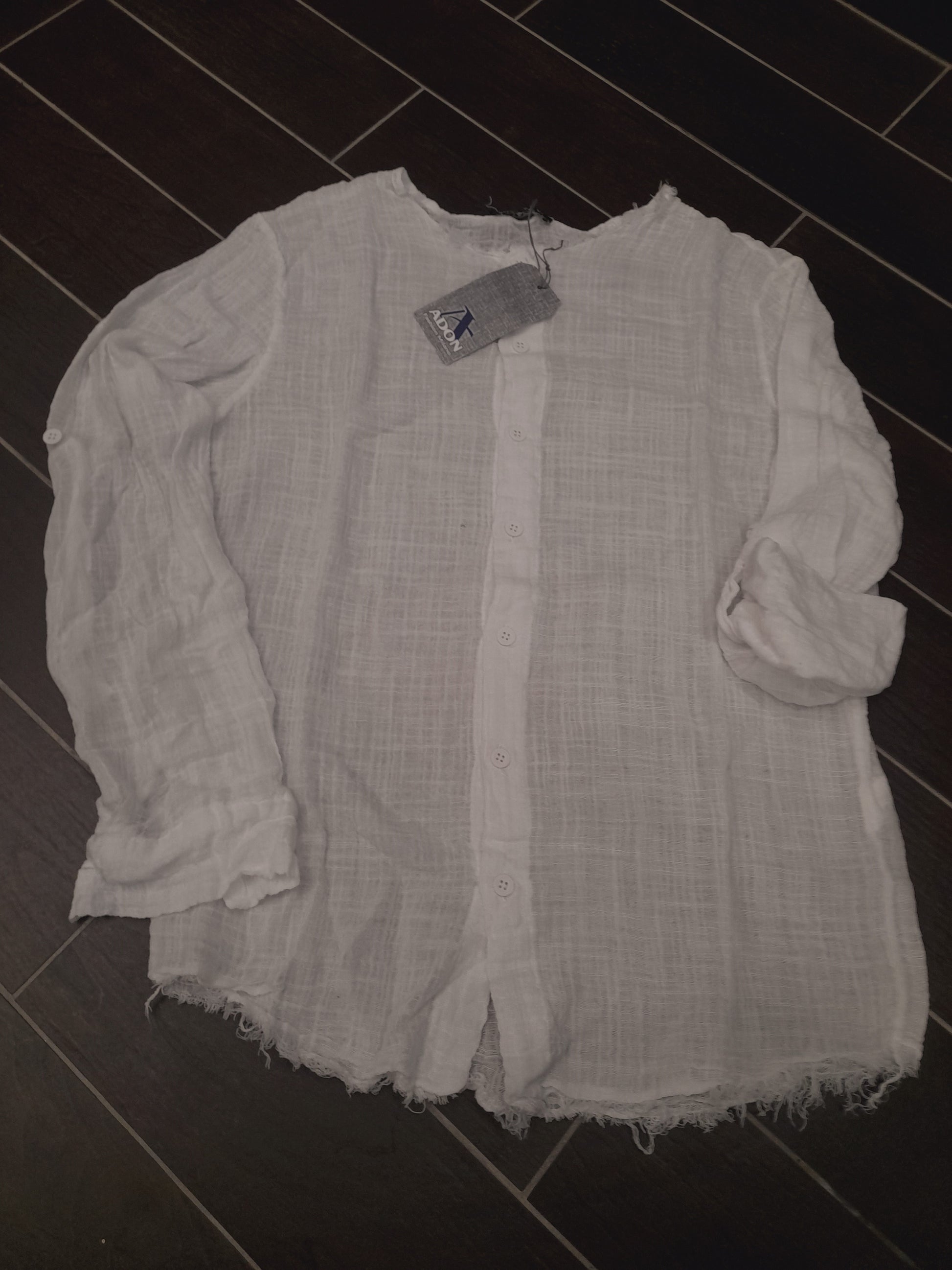 Camicia uomo in lino, bianca senza collo, senza cuciture, con maniche lunghe ed abbottonatura classica sul davanti.