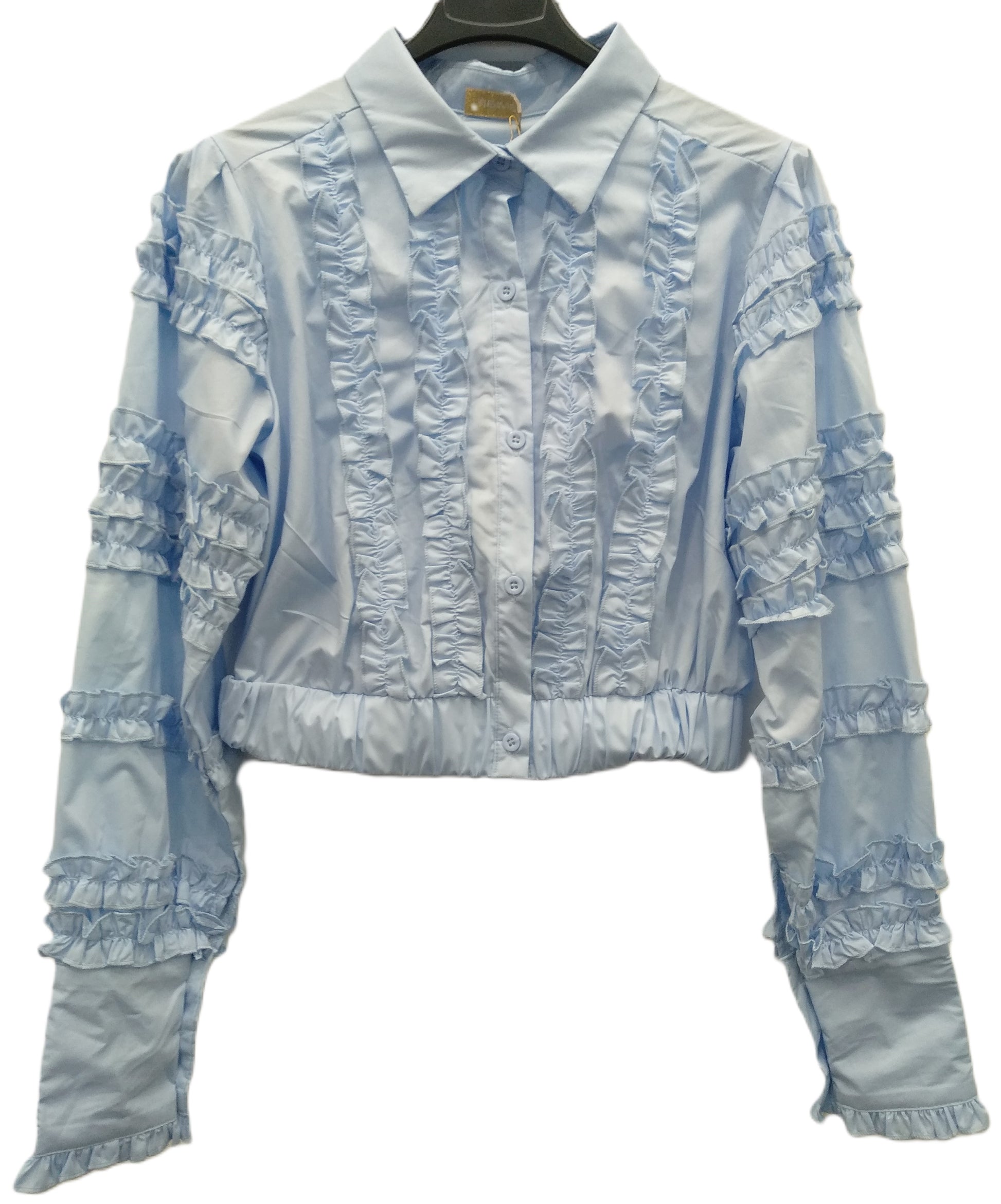 camicia in cotone morbido e confortevole, colletto rovesciato, maniche lunghe con bottoni al polsino , rouches per un allure romantico, elegante e alla moda.