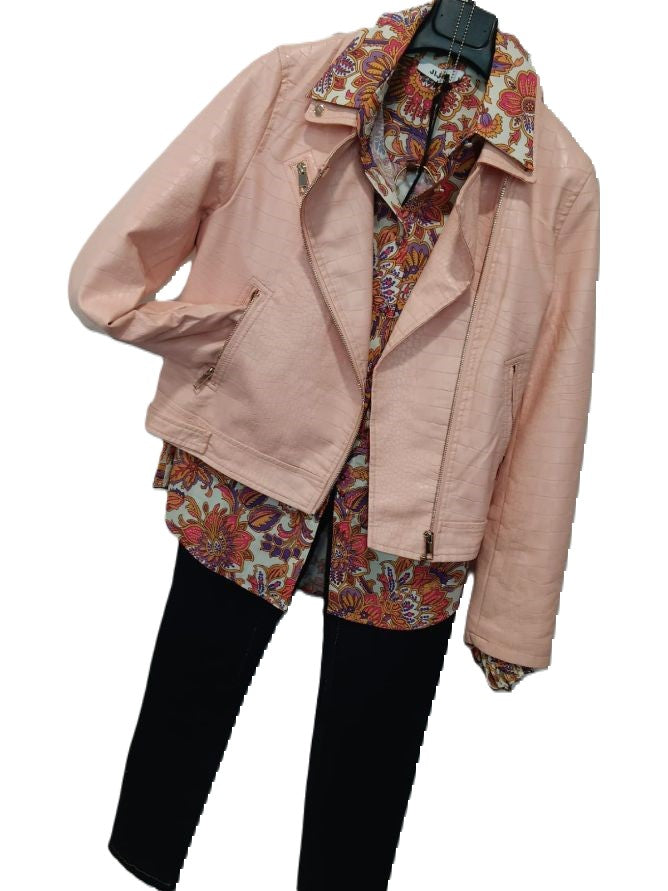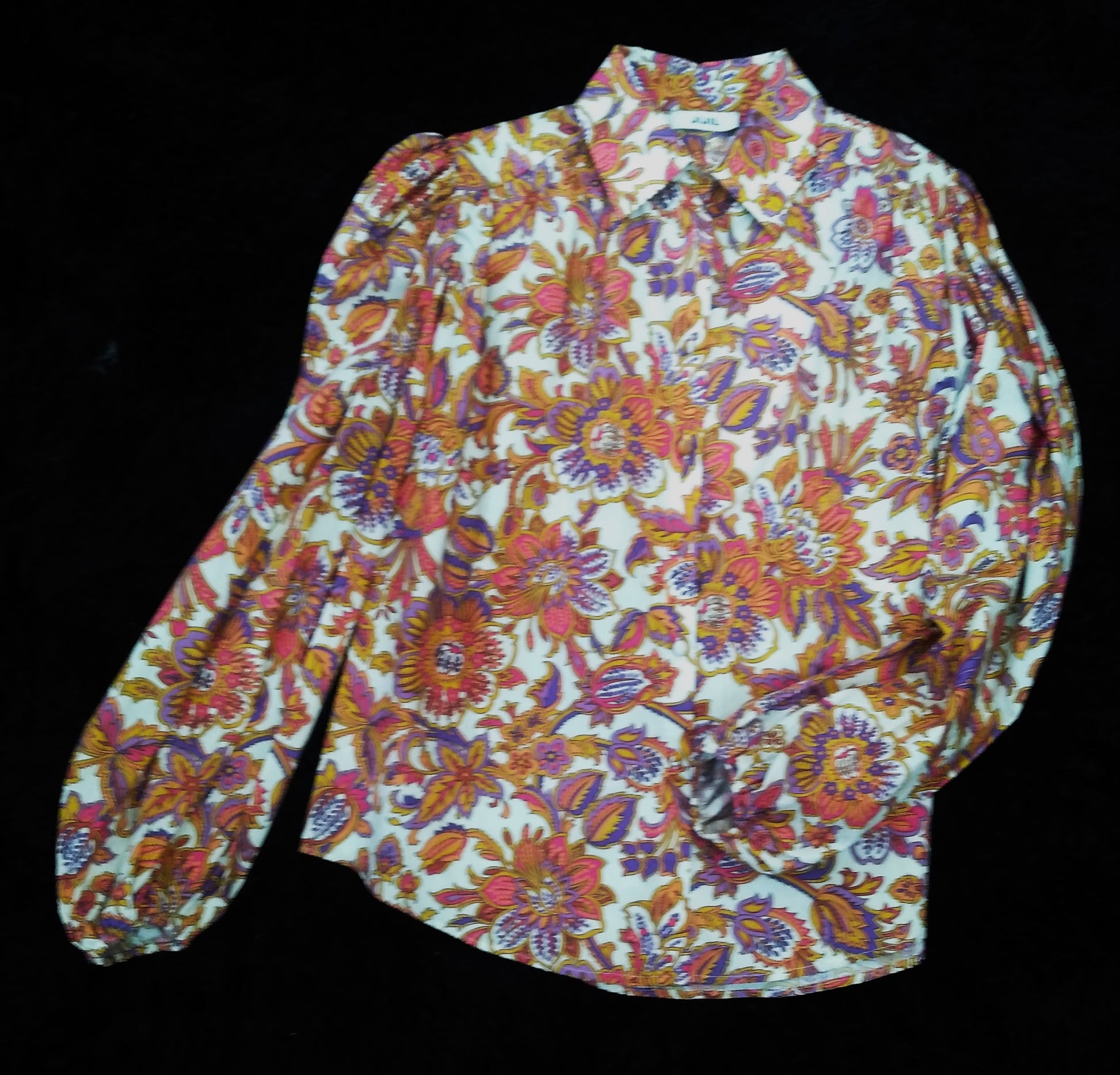 Camicia in cotone fantasia fiore , maniche a sbuffo , polsini con elastico, bottoni sul davanti a vista .
