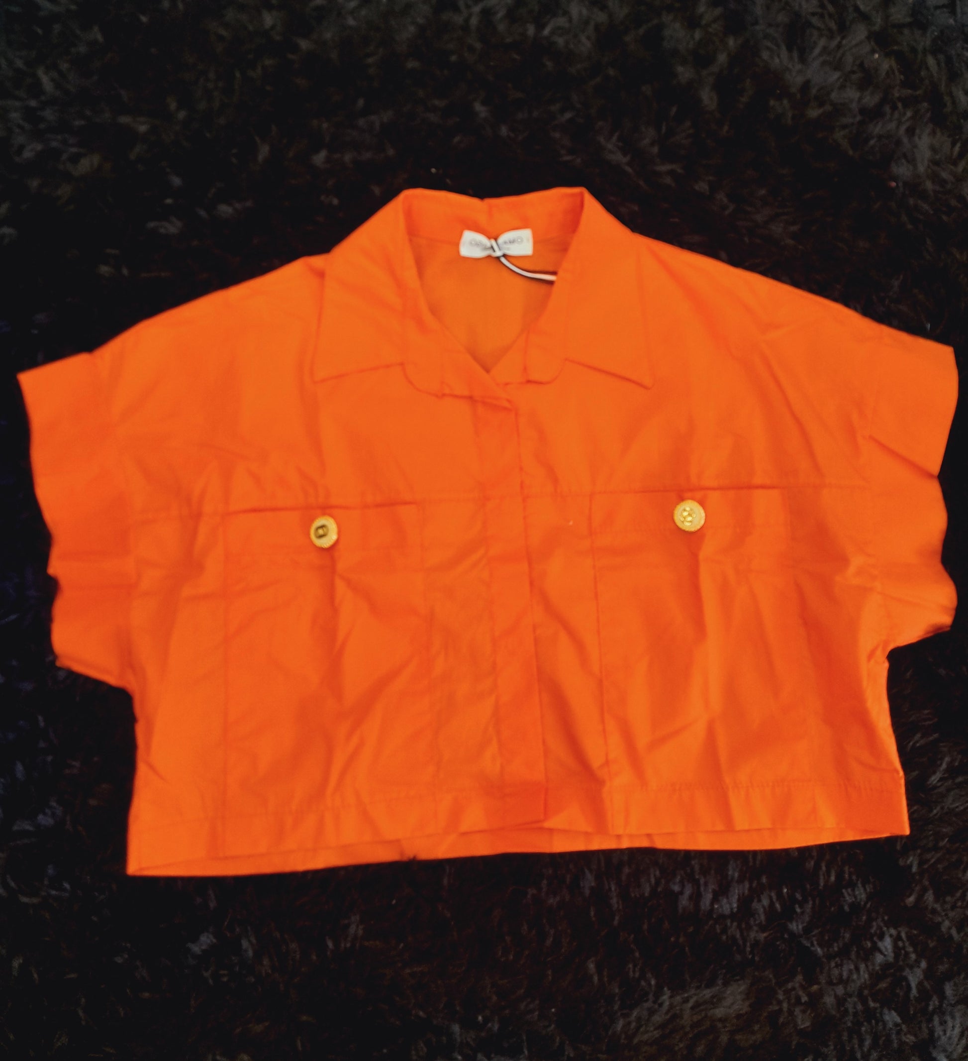 Camicia corta arancione, con due bottoni decorativi sul davanti, in cotone con maniche corte.