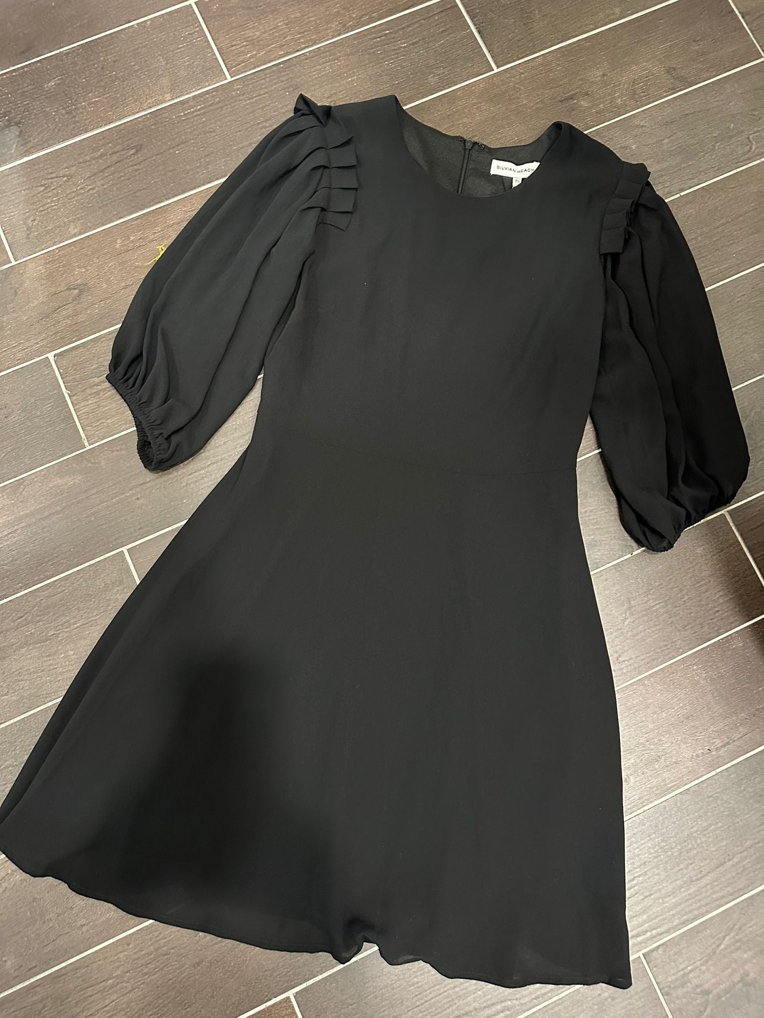 abito in chiffon svasato con cerniera sul dietro , lunghezza midi , stile romantico con maniche a sbuffo.