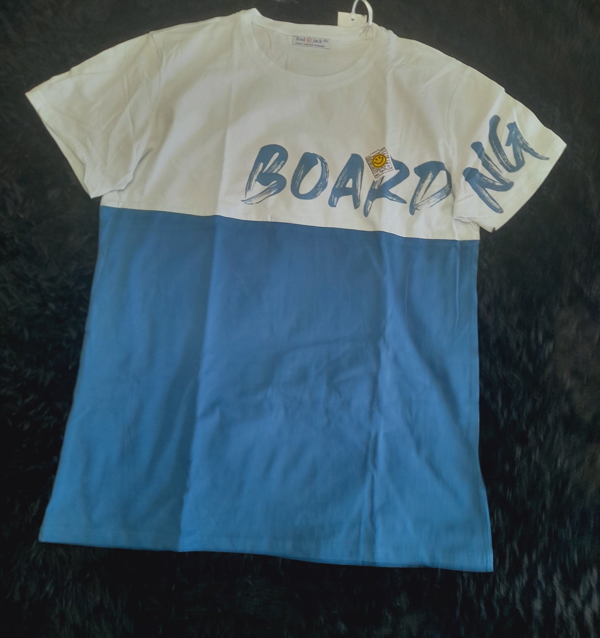 Maglietta in cotone a maniche corte bianca e azzurra, con collo a giro.