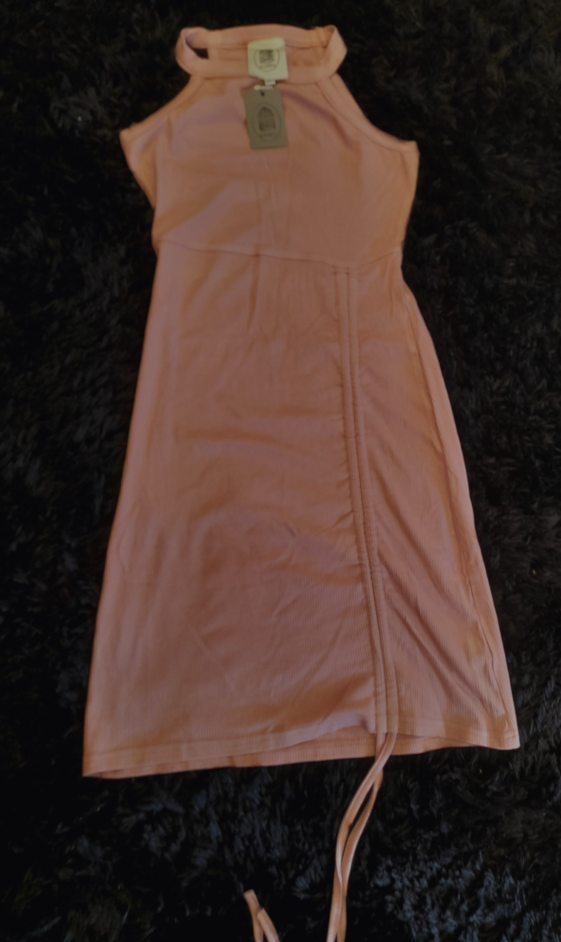 mini abito Le Volier, in cotone a costine, rosa cipria, smanicato, con lacci sul lato sinistro.