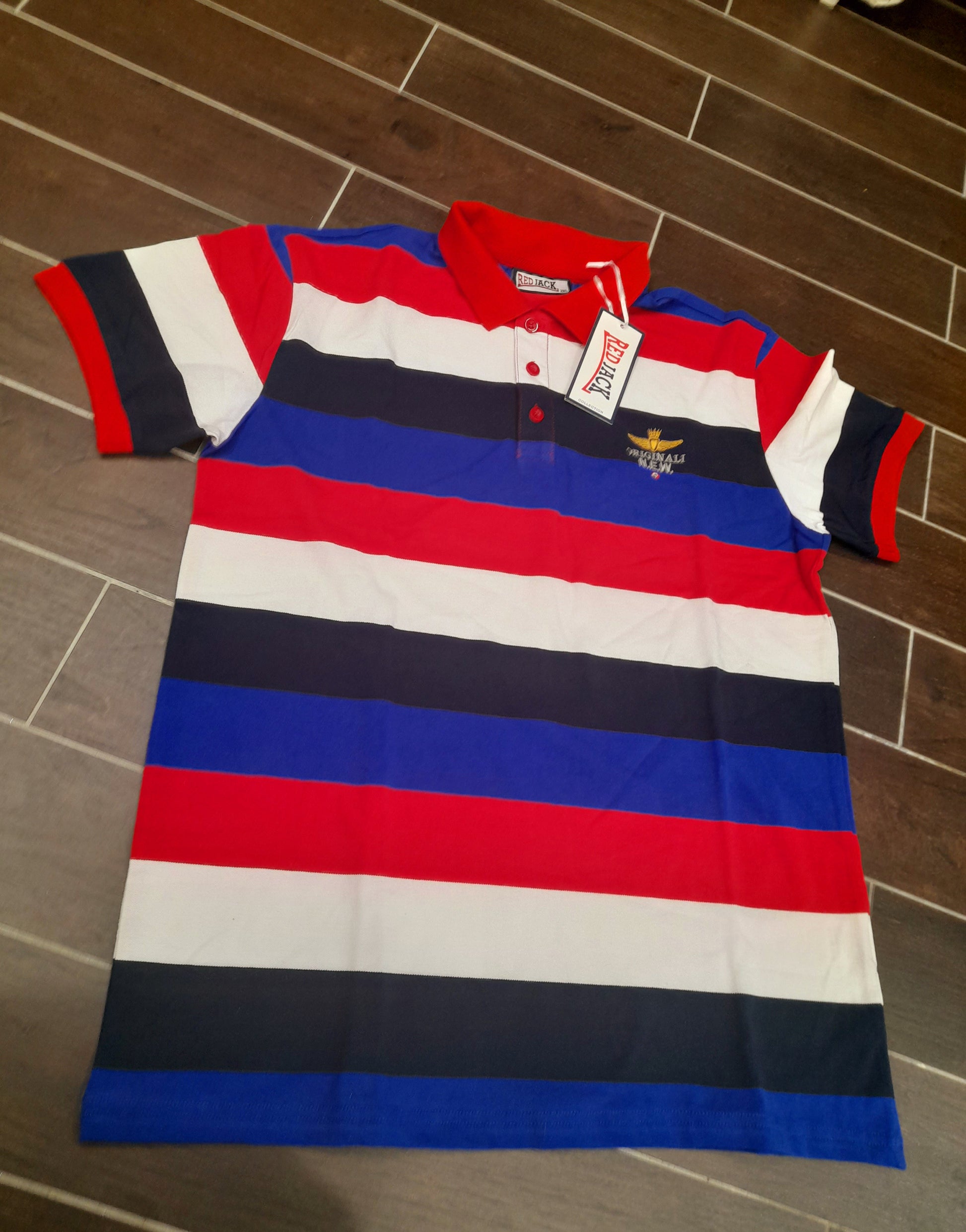 Polo maschile maniche corte, con strisce blu cobalto, blu, bianche e rossa.