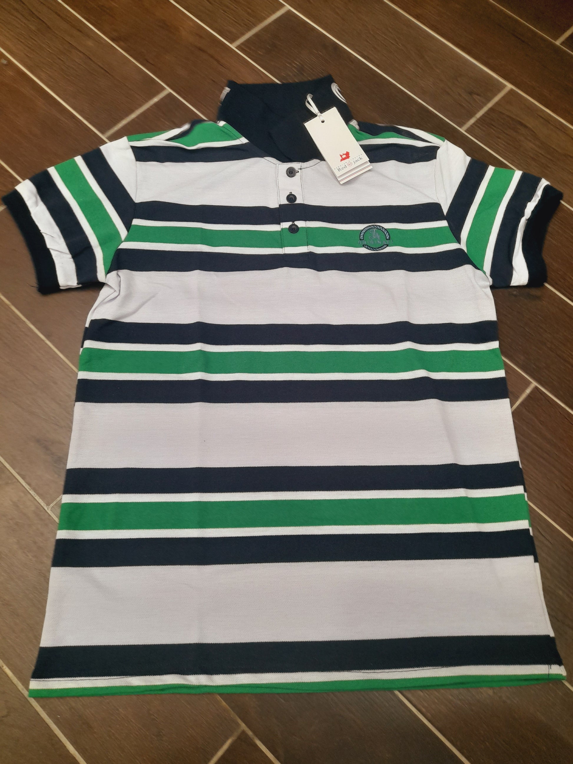 Polo uomo maniche corte, sfondo bianco con strisce orizzontali blu notte e verdi.