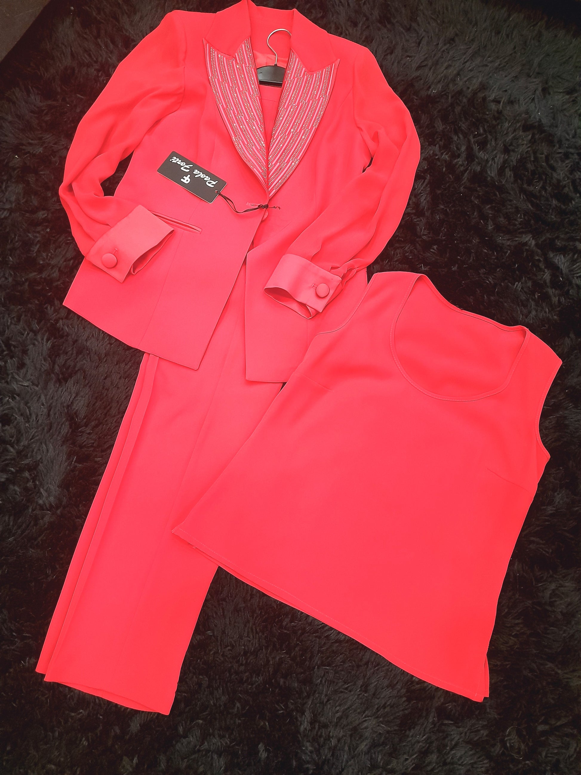Tailleur fuxia elegante, collo ricamato, con maniche velate, e sotto giacca a giromanica, vestibilità regolare, tessuto cady.