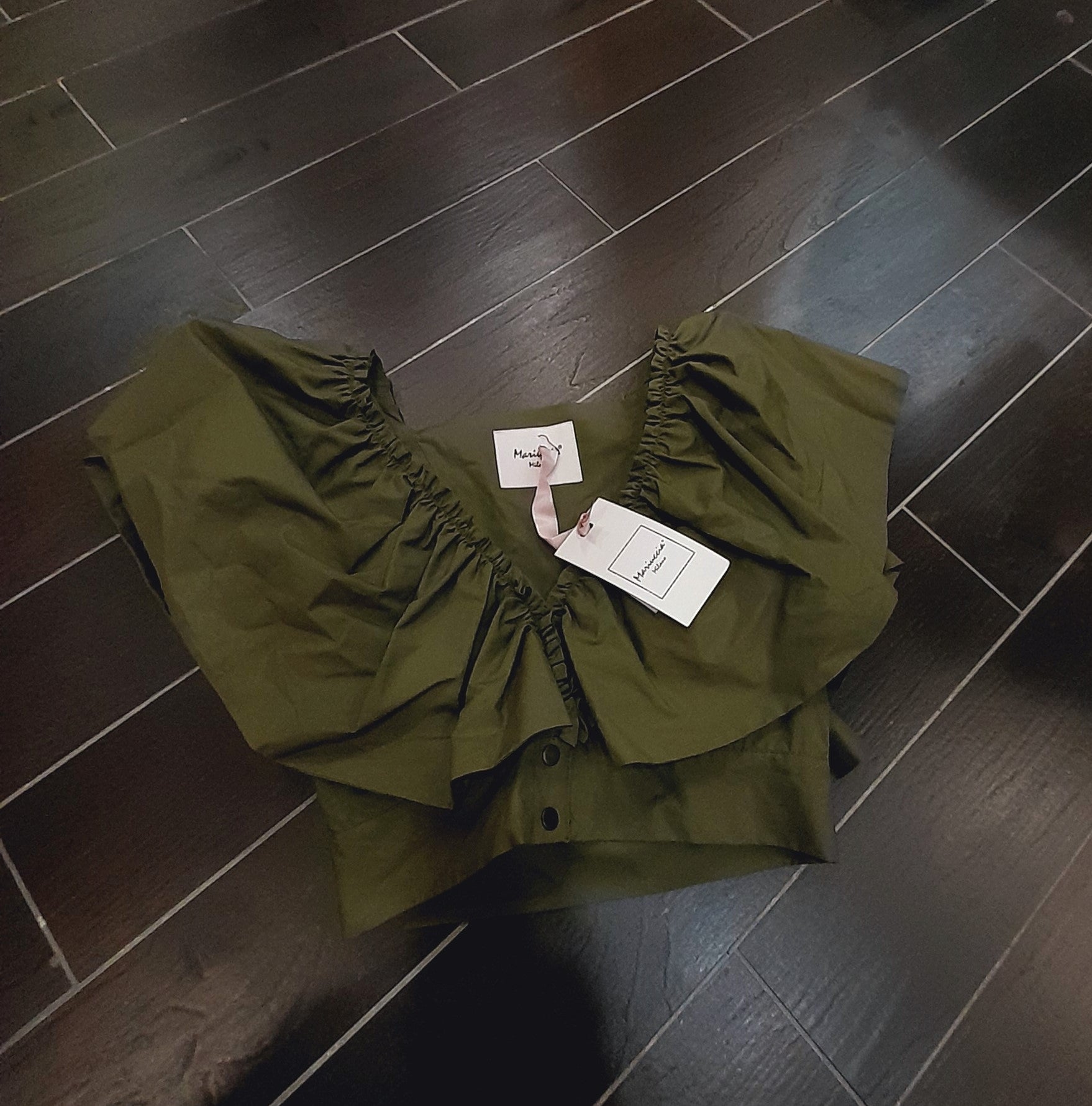 Top corto in cotone, verde, a giro maniche con voulant, scollo a V, con quattro bottoni a clips sul davanti.