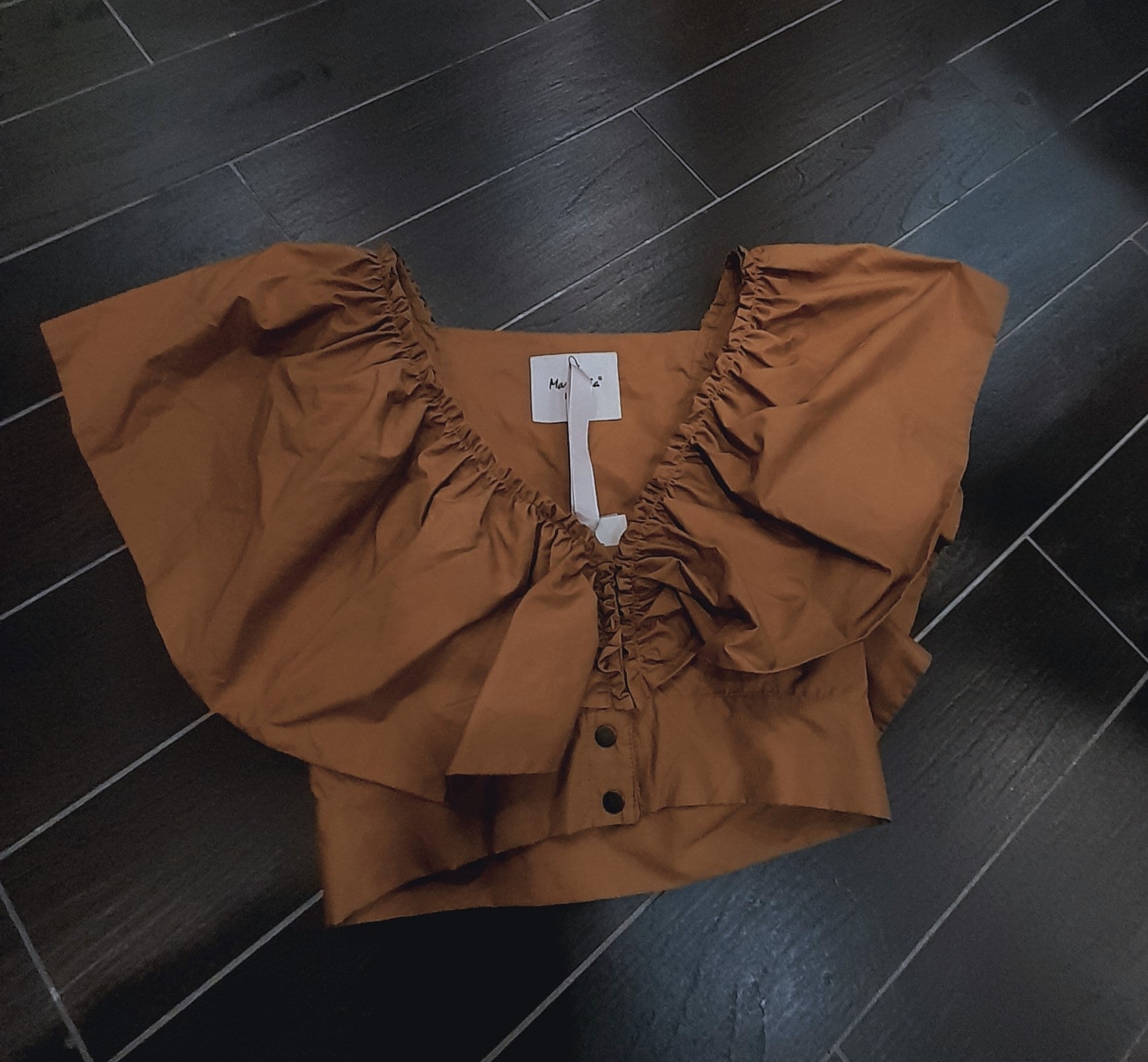 Top corto in cotone, marrone, a giro maniche con voulant, scollo a V, con quattro bottoni a clips sul davanti.