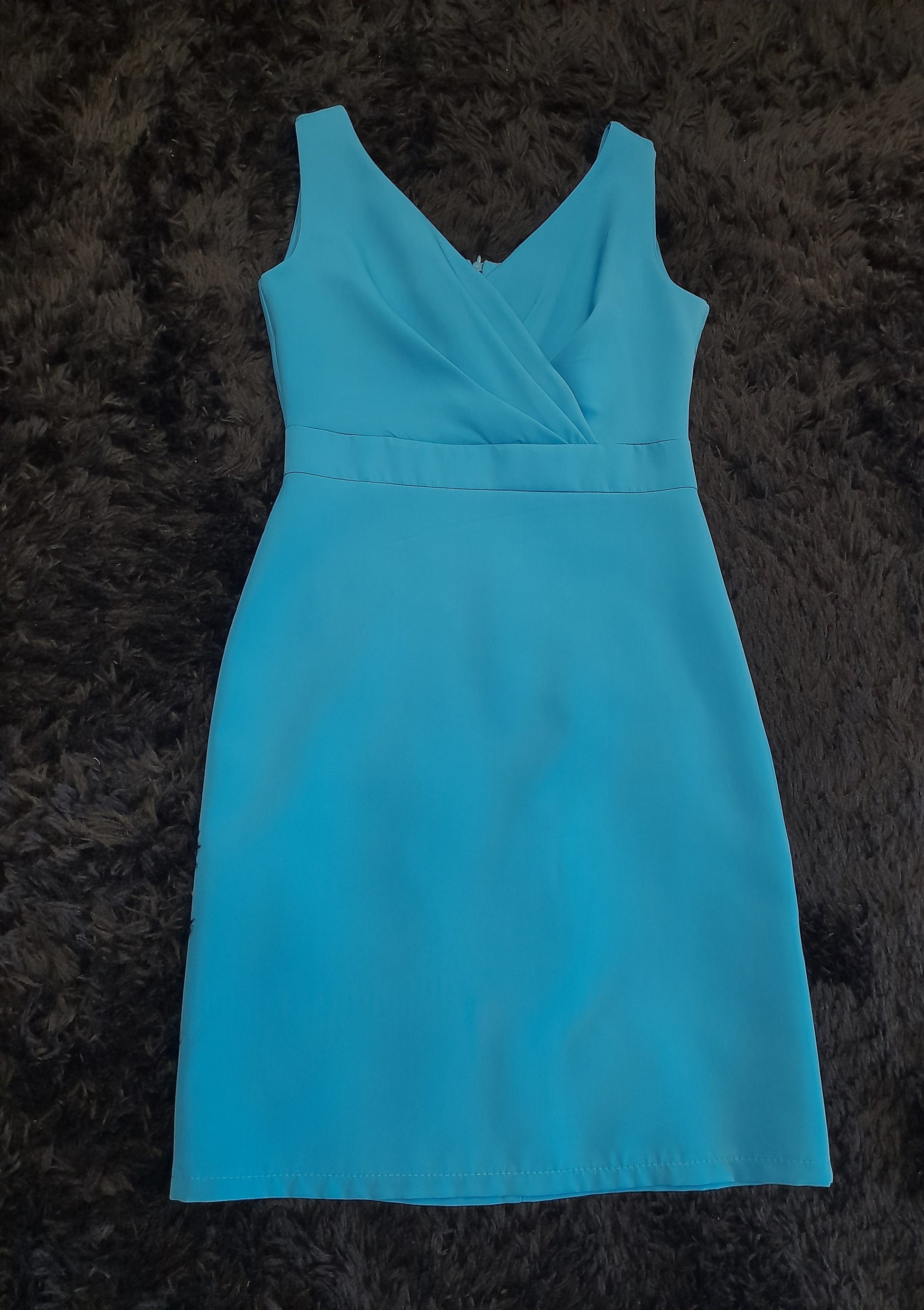 Tubino donna color turchese, maniche a giro scollo a cuore con balze e incrocio, elasticizzato con cerniera sulla schiena e scollo a giro.