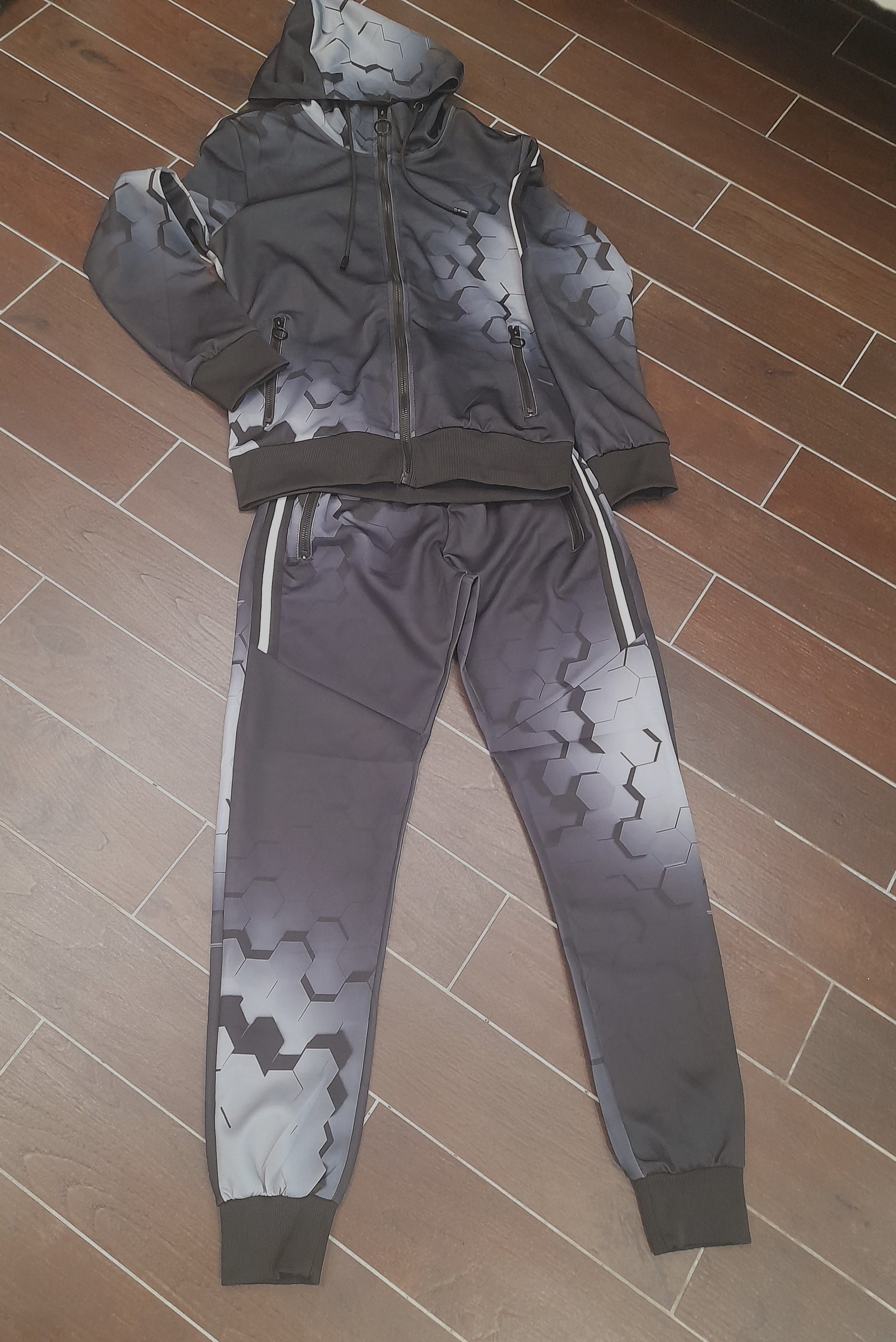 Tuta uomo in poliestere con cappuccio e cerniera, con tasche su pantalone e giacca con cerniera.