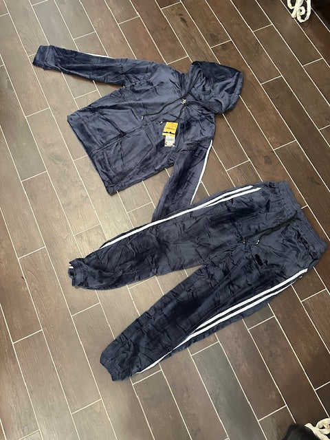 tuta in ciniglia con cappuccio e bande a contrasto bianche
