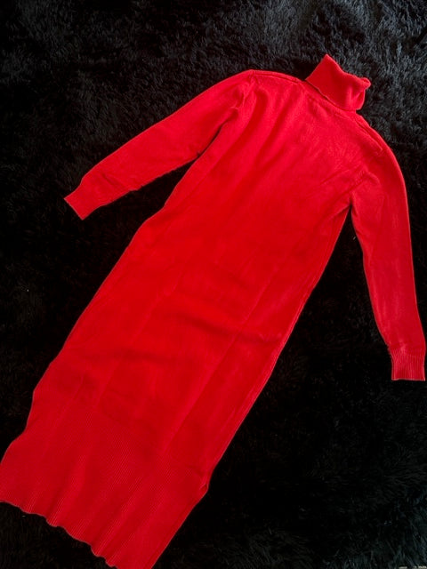 vestito lungo in maglia collo alto con spacchi laterali , colore rosso.